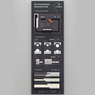 Стенд Безрамочное освещение. Включает в себя магнитные треки, светильники ATLAS, ORIENT, профили для установки под шпаклевку.